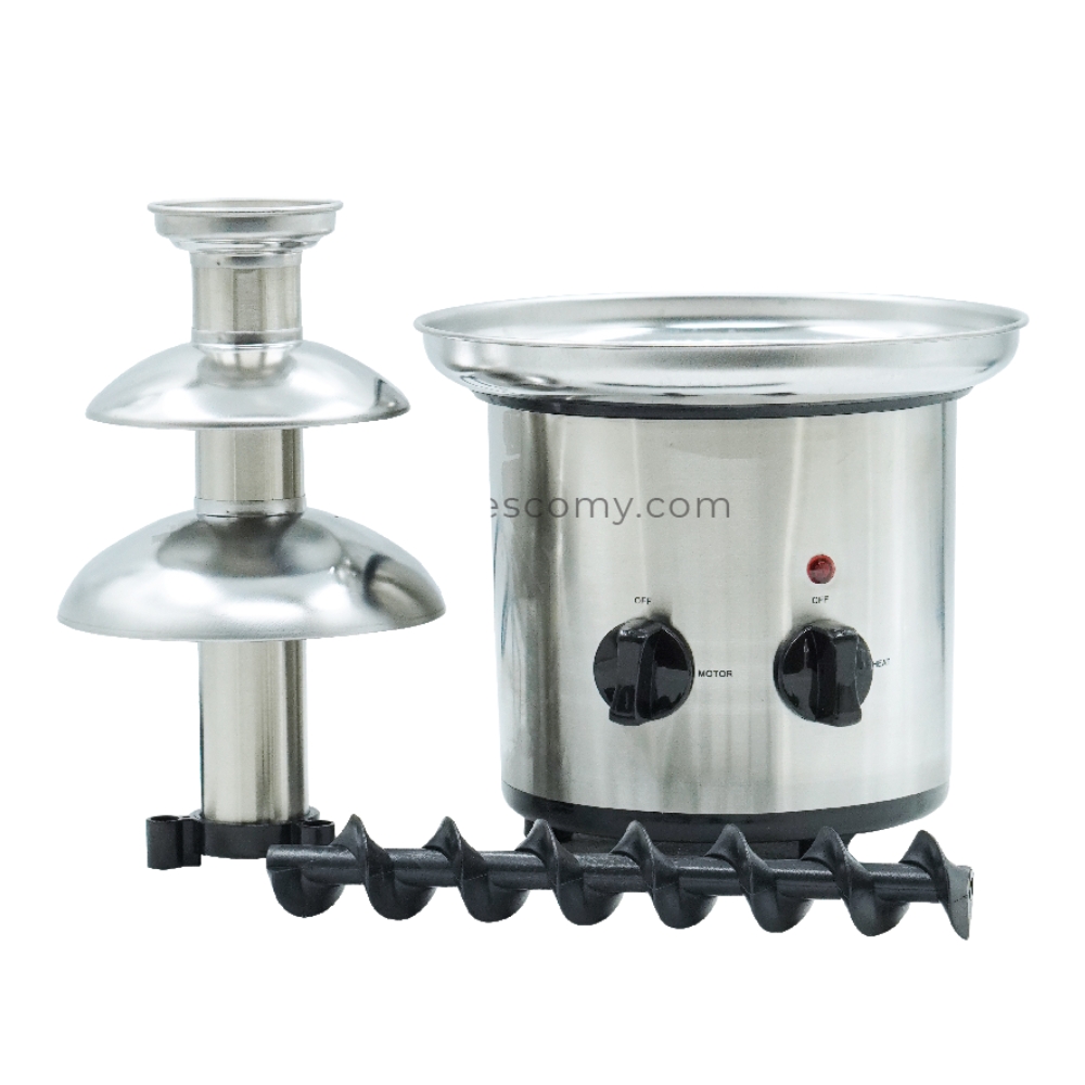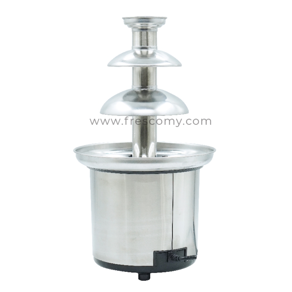 Home Chocolate Fountain 3-Tier FRS-001A by Fresco Malaysia. High-quality stainless steel design, quiet motor, 1kg chocolate capacity, easy assembly and cleaning. Perfect for household use and parties. 6-month warranty included.
